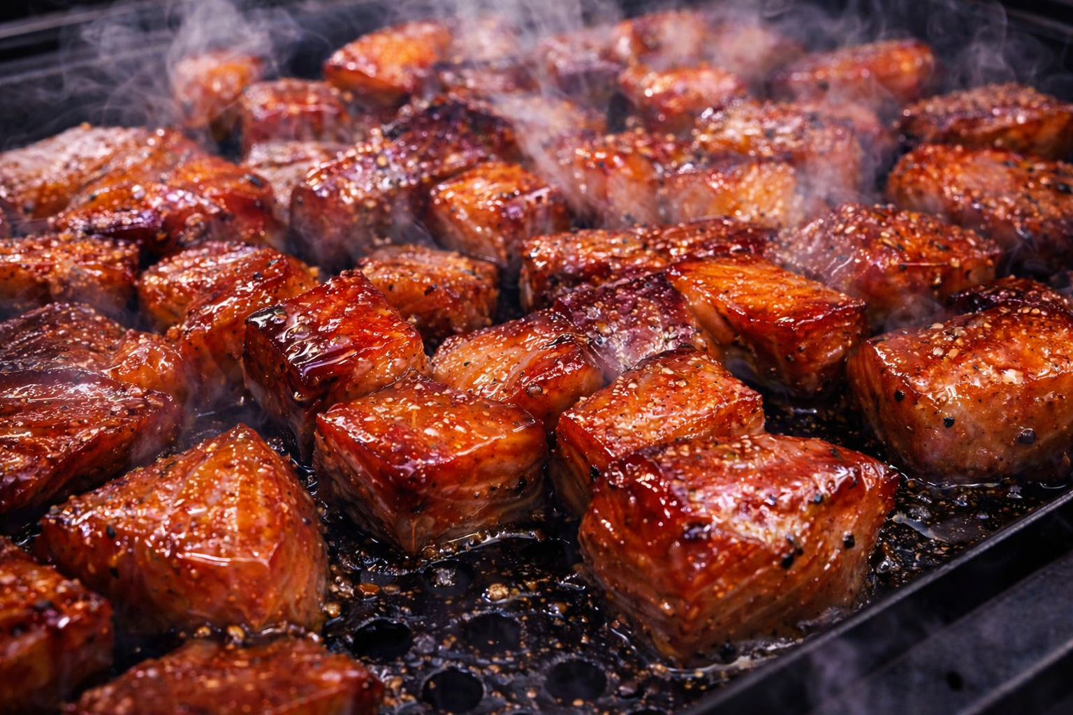 Laisse-toi tenter par nos bonbons de saumon version Street BBQ. De petits cubes fondants, passés au charbon en mode low & slow, puis glacés à l’érable jusqu’à ce que ça brille et que ça colle juste assez aux doigts.